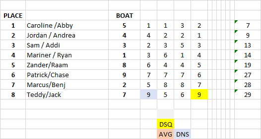 -Overall a great day of sailing for our team. Carloine/Abby showed the way today with patient, focused, and generally simple strategy, along with very good speed.