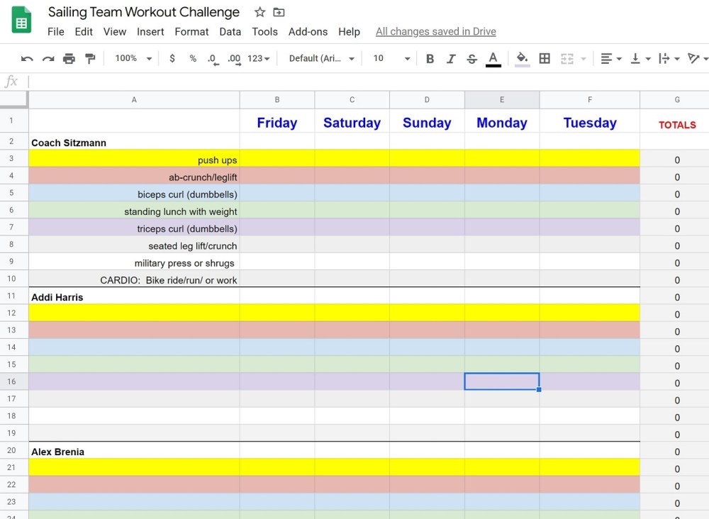 - Now, go to our Sailing Team Workout Challenge Spreadsheet, and carefully fill in your workout routine. I have done mine in advance as a guide. Fill in your seven (7) workouts, saving the last (bottom) row (which is gray) for your cardio.